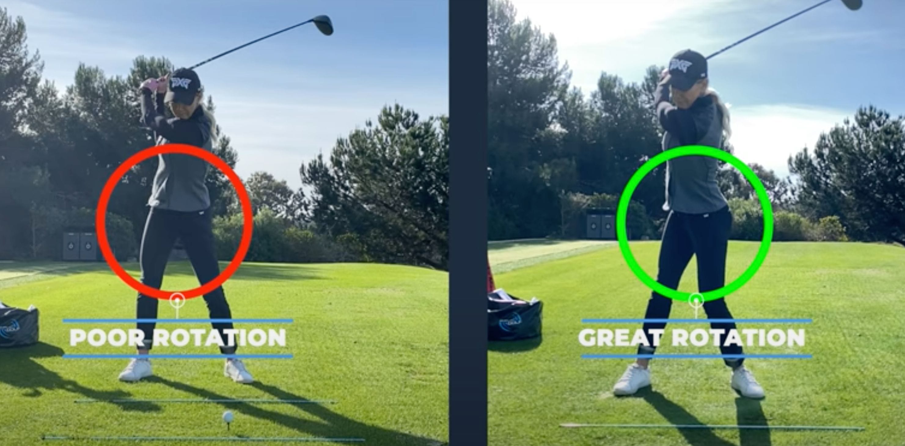 When trying this shoulder rotation out for yourself it’s important to remember that it’s okay for the legs to move and the trail leg to straighten a little to allow for a full shoulder turn. And when working on this we really recommend focusing on the ‘motion’ and not getting into specific positions on the downswing.