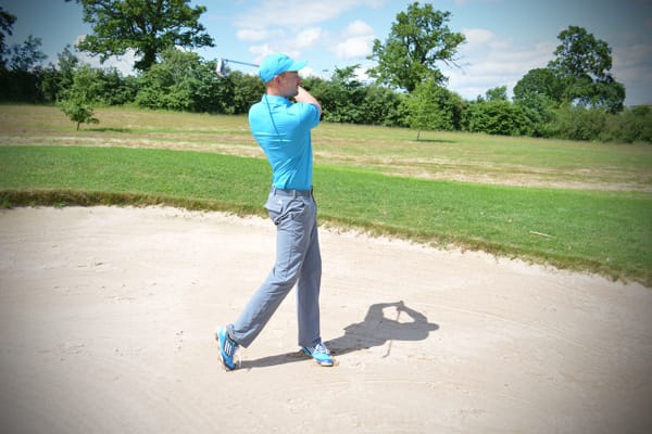 The best way to then get a solid contact on the ball is by having a shallow angle of attack unlike a green side splash shot.